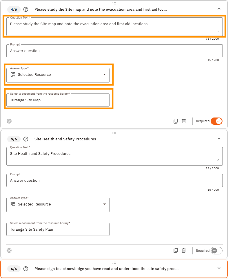 The Form Builder supports two new question types for Visitor Register forms. You can add multiple questions of any type. While multiple signature questions aren’t common, you might include several resource questions to ensure visitors view all relevant safety information.