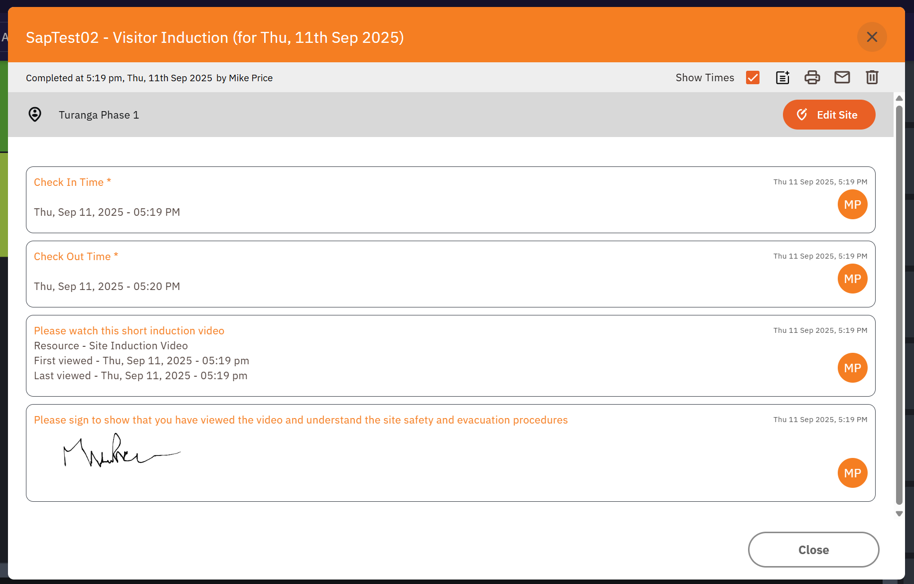 You can add resource questions (videos, images, PDFs, or links) and signature questions to your Visitor Register forms to improve site safety. Visitors can view safety-related resources and provide a signature to confirm they understand and acknowledge site safety procedures, evacuation requirements, or other critical safety information.