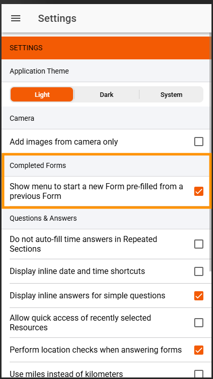 Mobile users who prefer not to use this feature can turn it off in their mobile app settings. Once disabled, the new menu will be bypassed, and forms will open as usual without the option to start from a previously completed version.