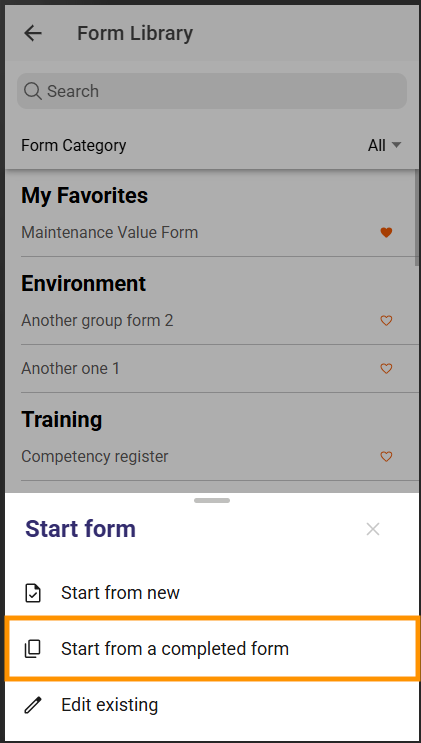 This feature enables you to start a new form using a previously completed one within the mobile app. The users can either: