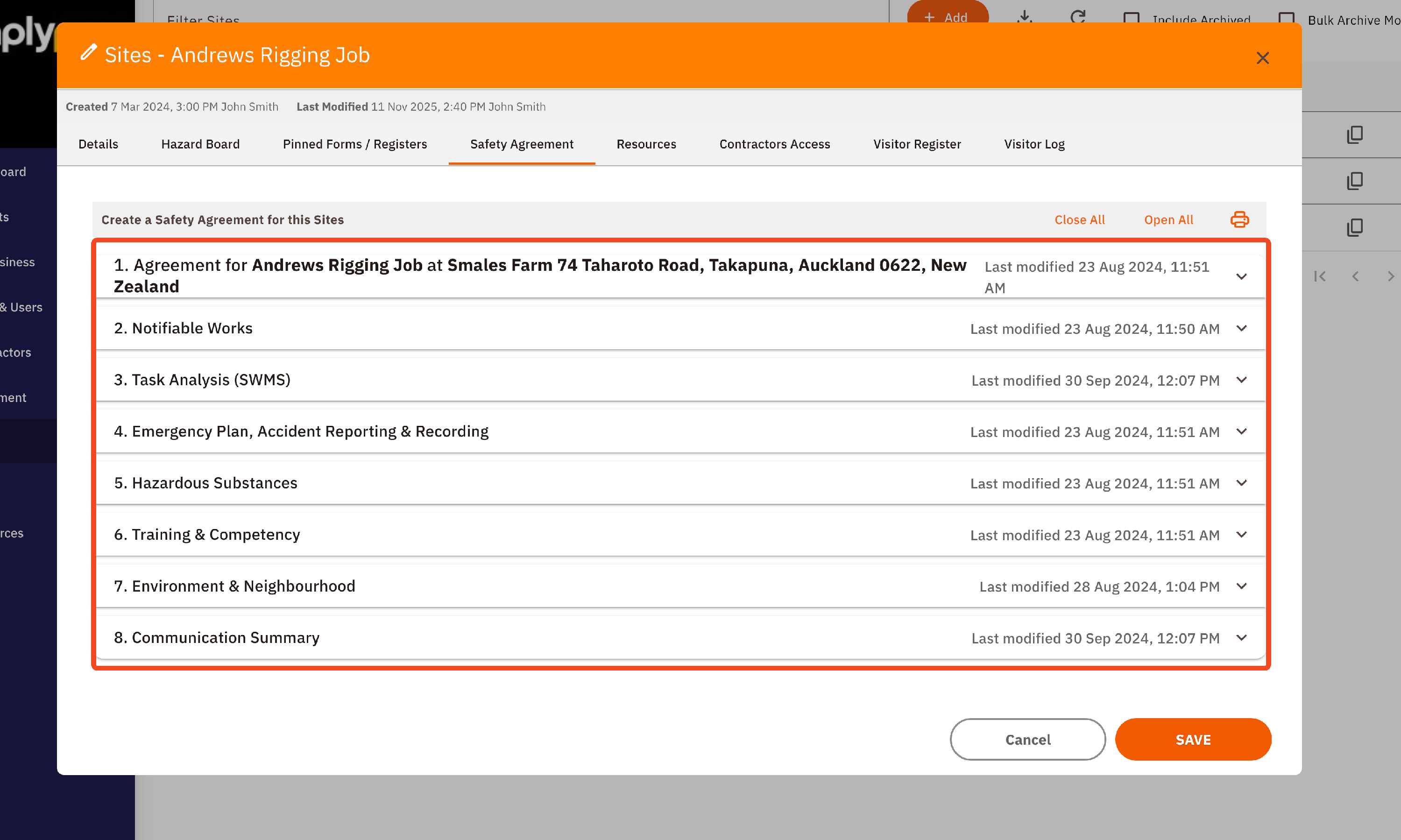 Note: If something changes on-site, you can go back to view or edit your Site Safety Agreement. You can keep track of this by looking at the last modified date on each section, this updates each time you change something in your SSSP