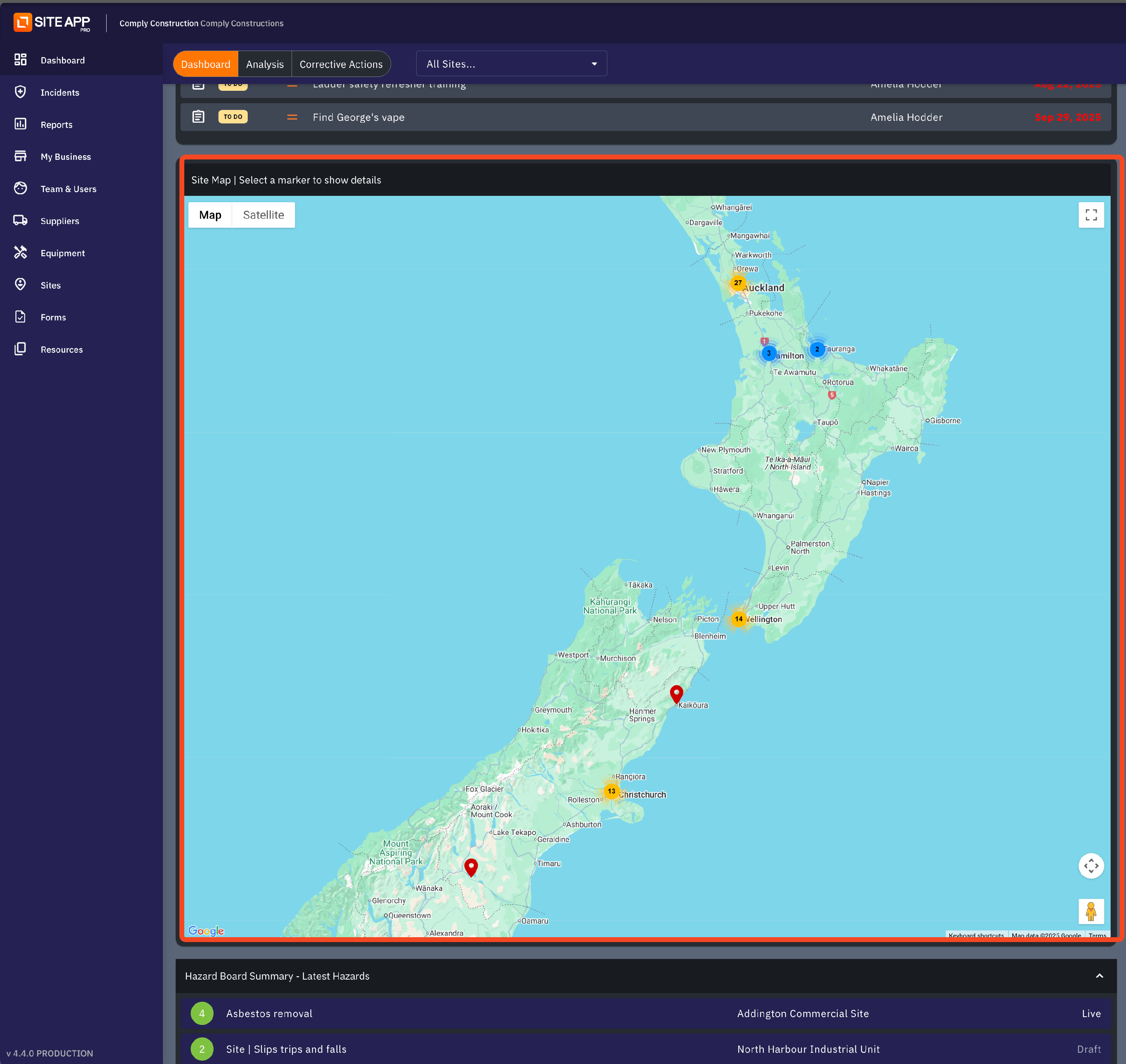 You can visualise all of your sites using the Site Map tool on your Dashboard. Use the Site Map to view all active and inactive sites, see recent check-ins, or access site information directly from the map.