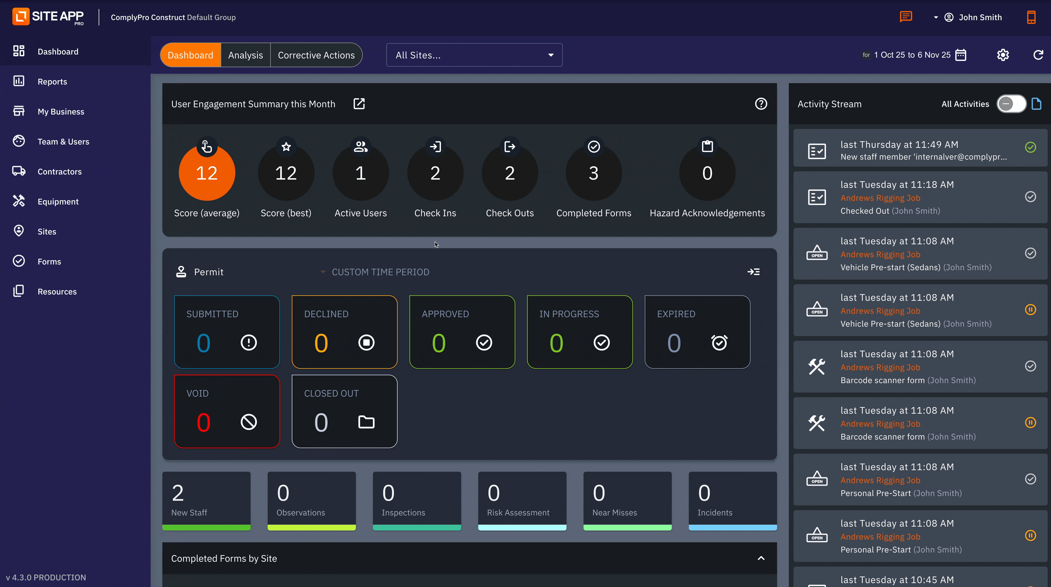 - Complete daily, weekly, or monthly forms (e.g., Pre-starts, Toolbox Talks, Vehicle Checks).