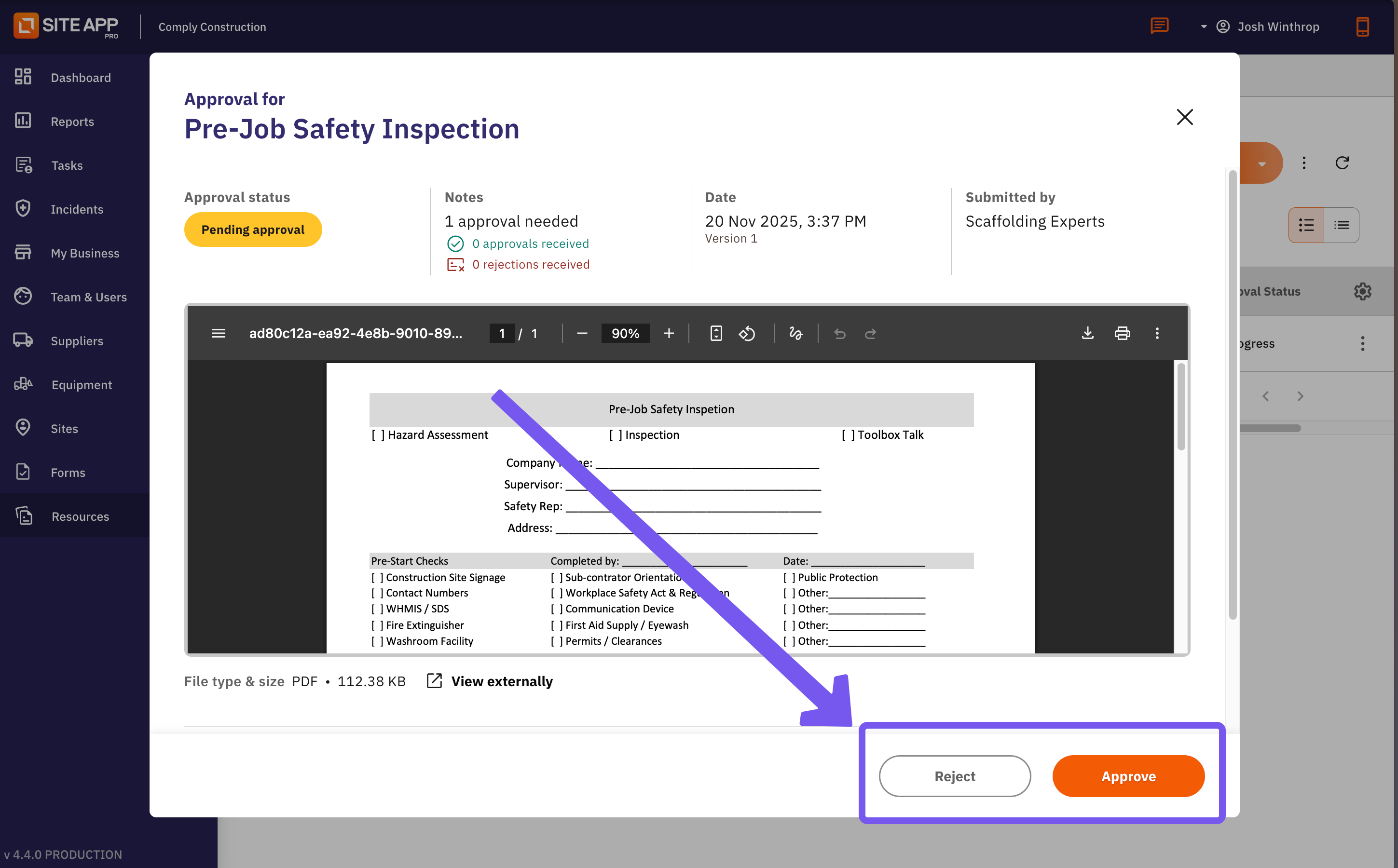 Our document approval workflow in Site App Pro ensures contractors submit necessary documents before arriving on-site. Expired documents trigger notifications for updates. All new documents undergo approval. Our privacy settings allow customization, restricting visibility to only your team and the contractor's company, providing peace of mind.