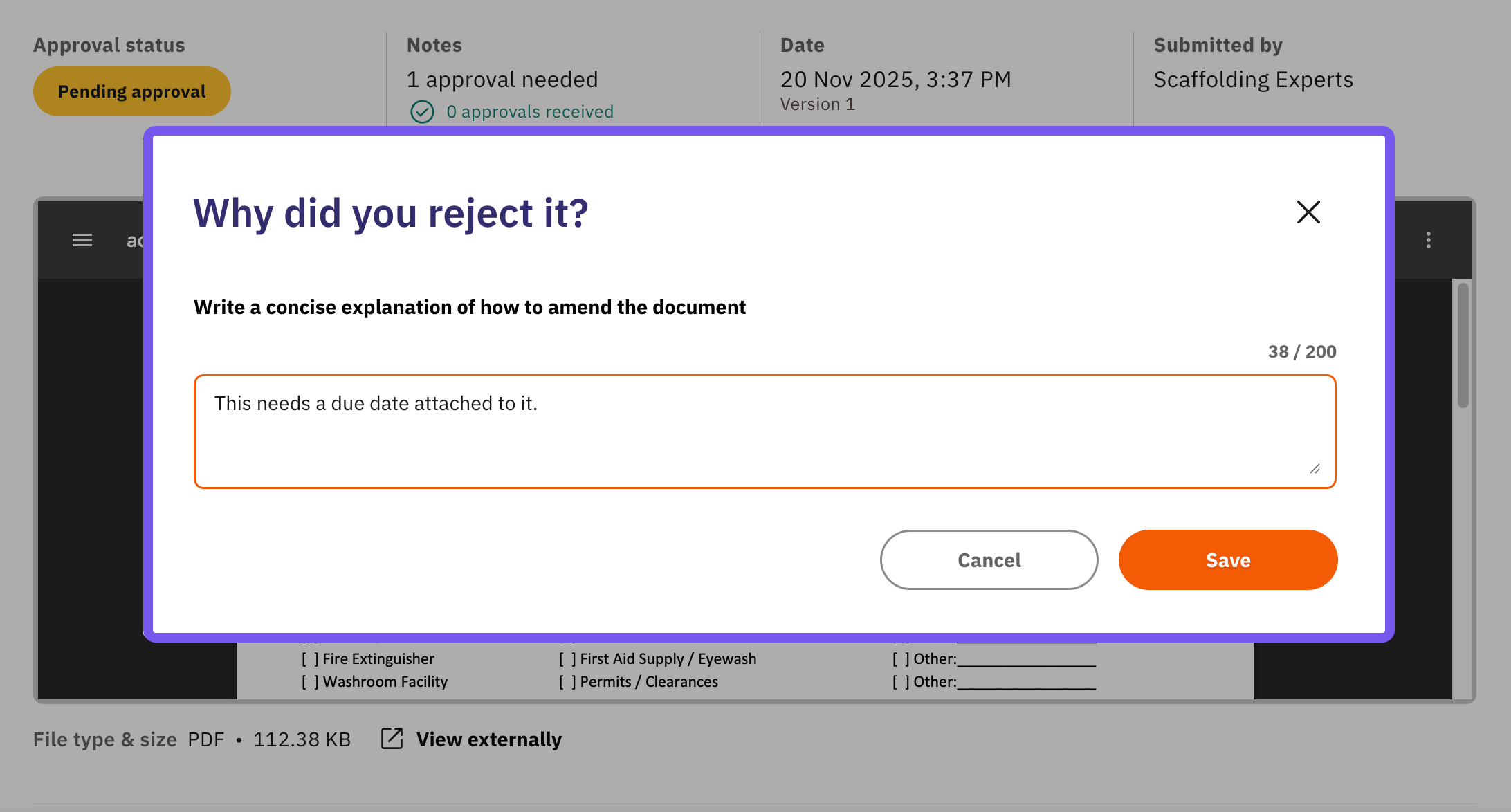 If you reject the document, you will be prompted to add a blurb of why. This will go to the Sub-contractor who submitted the document to review.